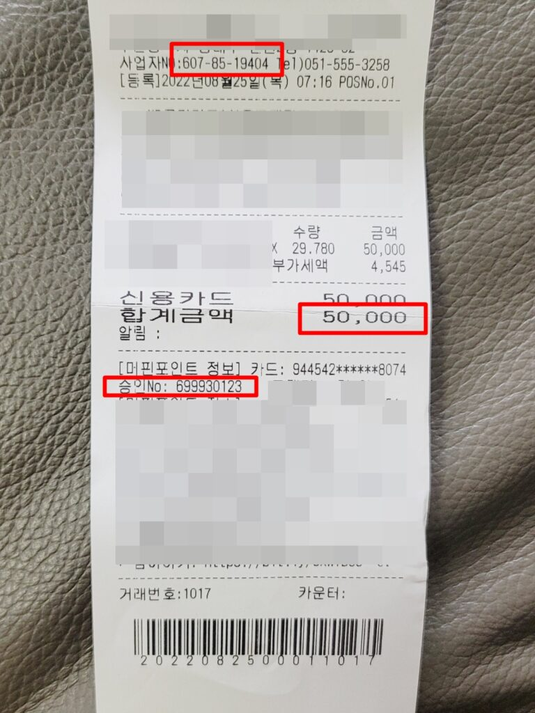 - 복권을 응모하실 때 위 이미지 3개 빨간색 네모의 정보가 모두 기입이 되어있어야하고, 소비처 사업자등록번호, 소비금액, 승인일련번호가 보여야합니다.