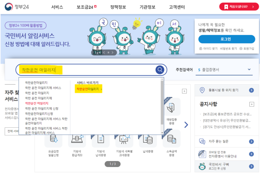- 중앙 검색창에 ‘착한운전마일리지’ 검색