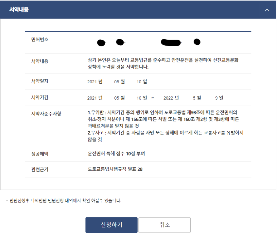 - 서약기간 중에 교통사고를 유발하거나 교통법규 위반시 사건이 발생한 다음 날부터 다시 서약하실 수 있습니다.