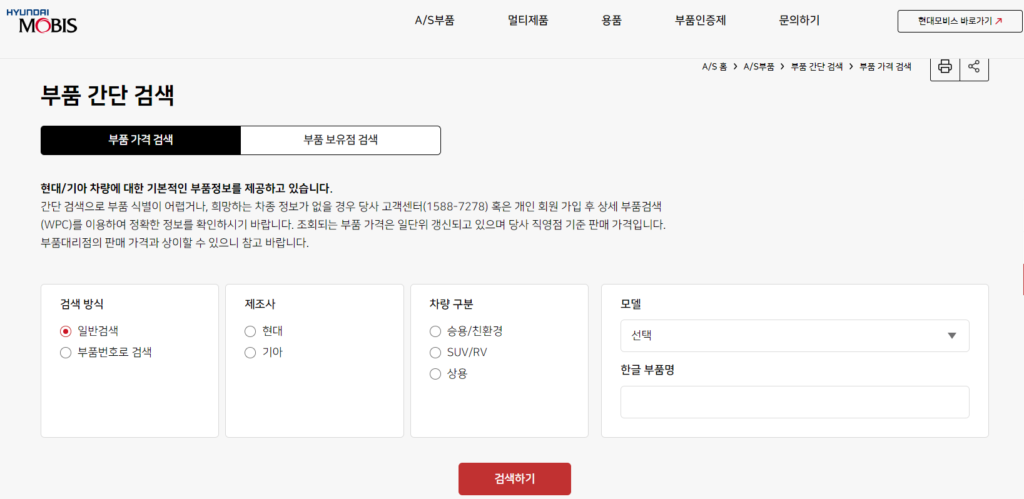 첫 메인화면에서 상단 A/S부품 > 부품간단검색 순으로 접속하시면 아래와 같은 화면을 보실 수 있습니다.