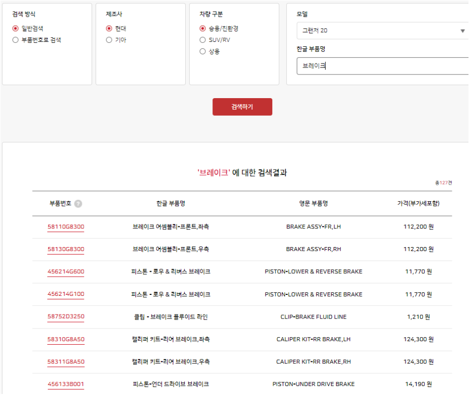 검색에 필요한 정보를 모두 입력하고 검색하기를 누르면, 아래 이미지와 같이 해당되는 부품과, 가격까지 상세한 정보를 취득하실 수 있습니다.